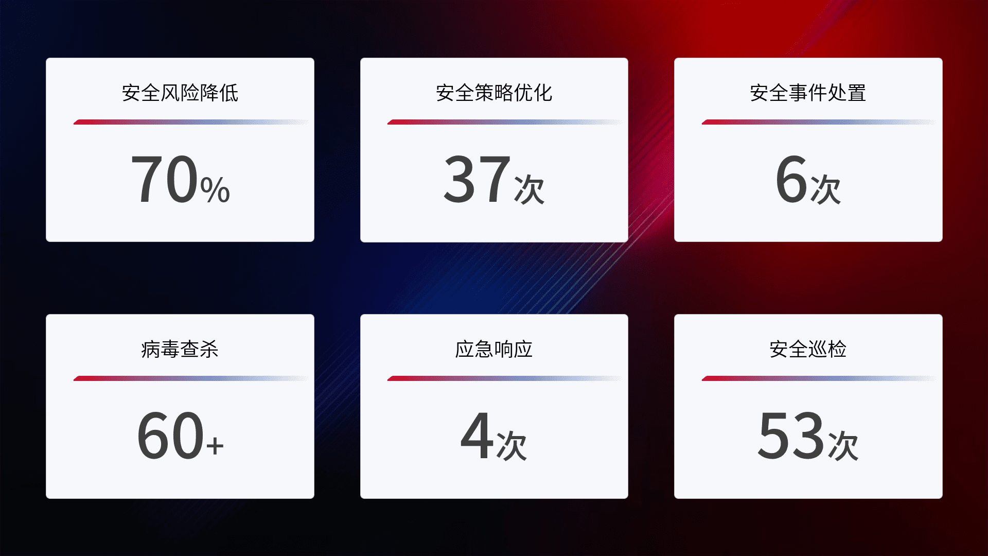 提供全面的安全事件报告体系,,,,包括处置报告、、、周报、、、、季度和年度总结,,,,结合持续监控,,,,帮助客户深入了解网络安全状况。。。。
